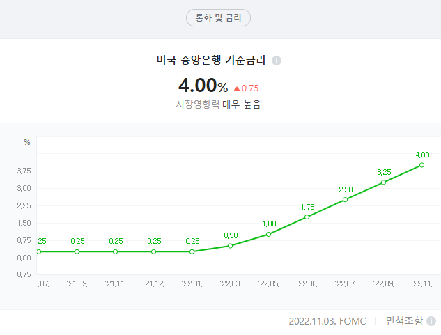 미국FED 기준금리 22년 1월 0.25% > 11월 현재 4.0%