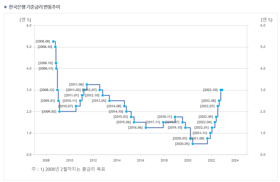 한국은행 기준금리 22년 1월 1.25% > 11월 현재 3.0%