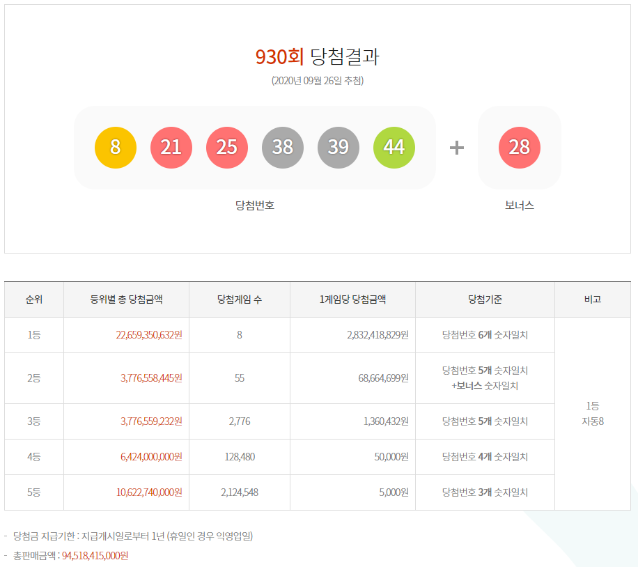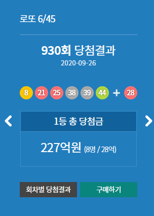 당첨번호 8 21 25 38 39 44 보너스번호 28 1등 총 당첨금 227억원(8명 / 28억) 이전 회차 당첨정보 보기 다음 회차 당첨정보 보기