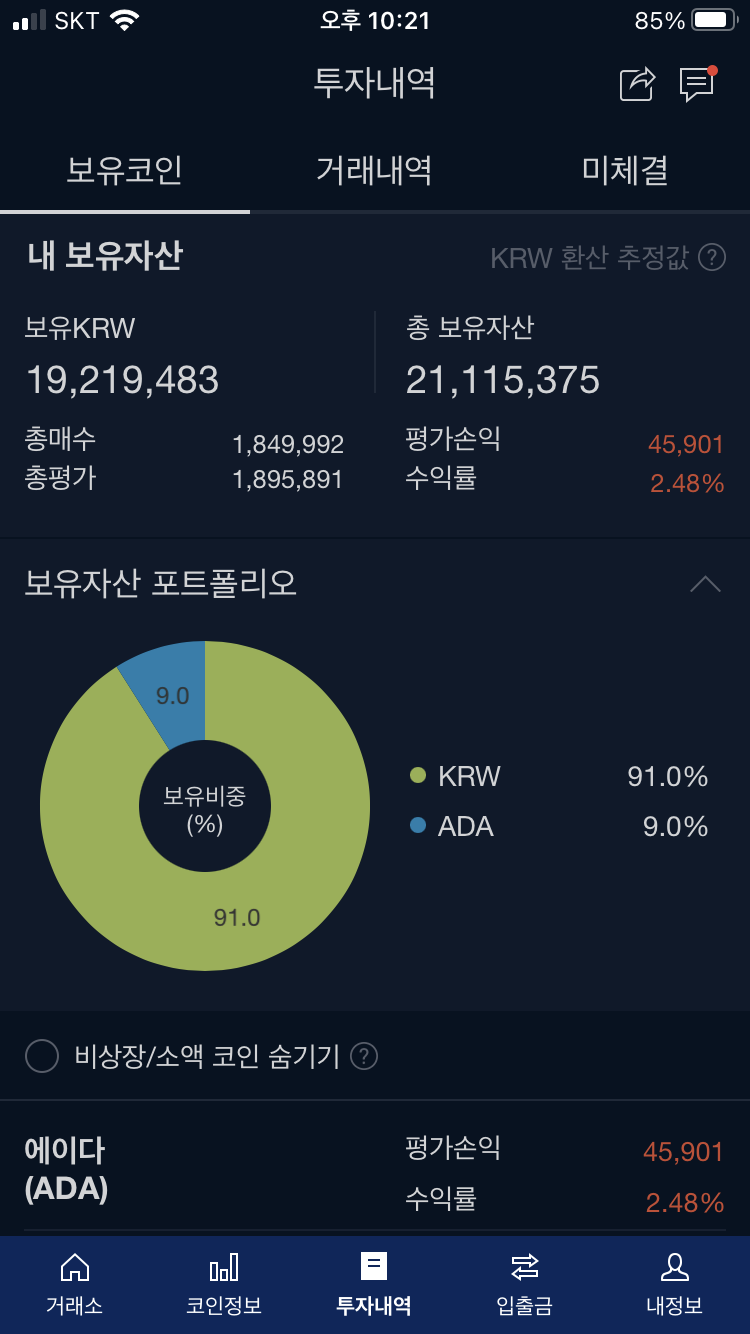 현금 91% 코인 9% 에이다 비중 늘리며 추매