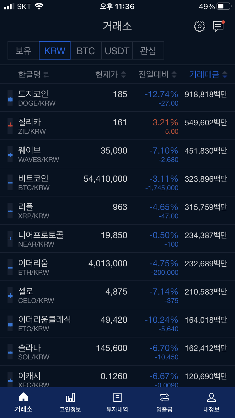 업비트 기준 3개 코인 상승 117개 코인 하락